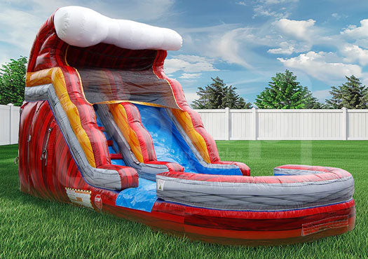 13' Fire Wave Water Slide with Splash Landing. Escape to a tropical paradise with the Big Top Inflatables 13' Fire Wave Water Slide with Pool! Whether you're looking for the perfect addition to your next backyard bash or seeking a compact yet exciting attraction for your business, this water slide is a guaranteed winner.