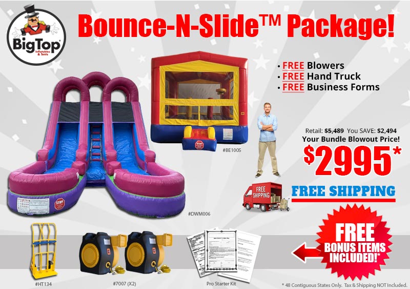 Bounce-N-Slide Bundle Package Deal by Big Top Inflatables. Elevate your event business with the Big Top Inflatables Business Bundle Package, designed for maximum fun and profitability! You'll get a vibrant Classic Bounce House and a captivating 15' Double Lane Water Slide – perfect for creating memorable moments.